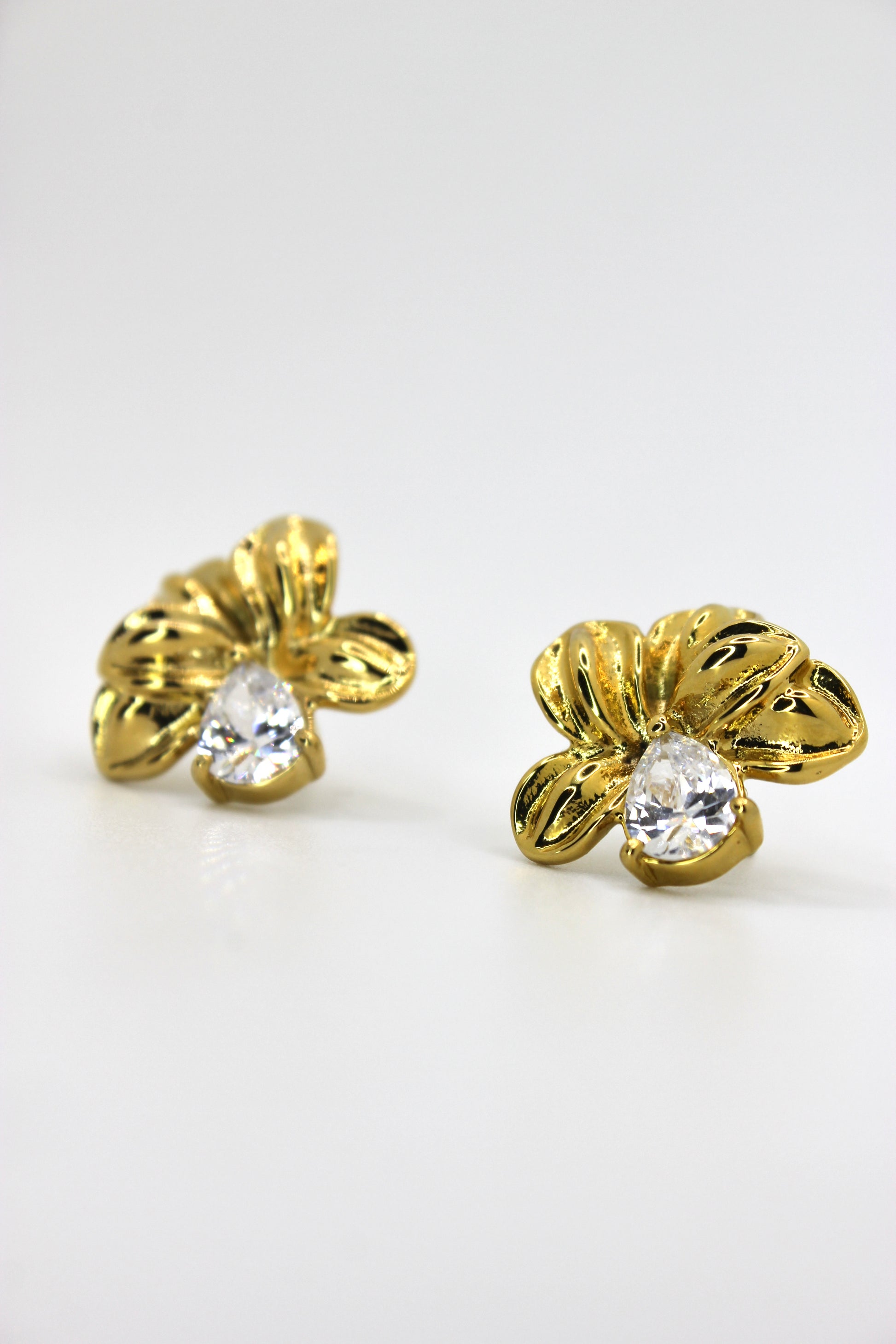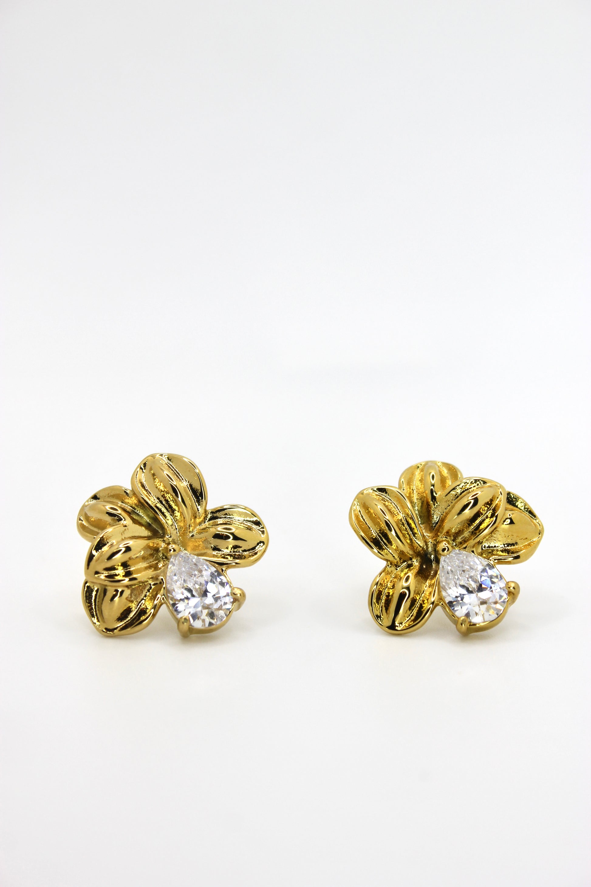 The Floria earrings reveal an elegant flower in gold-plated stainless steel, enhanced by a teardrop-shaped crystal that beautifully captures the light.