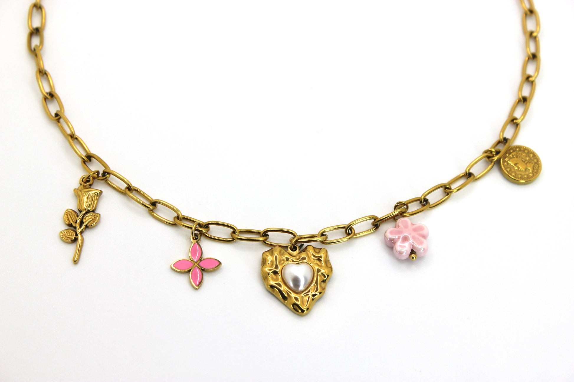 De Amara Bloom ketting combineert een brede, 18-karaats vergulde roestvrijstalen ketting met een selectie delicate bedels: een getextureerd hart versierd met een parel, een roze keramische bloem en een geëmailleerd bloemenmotief.