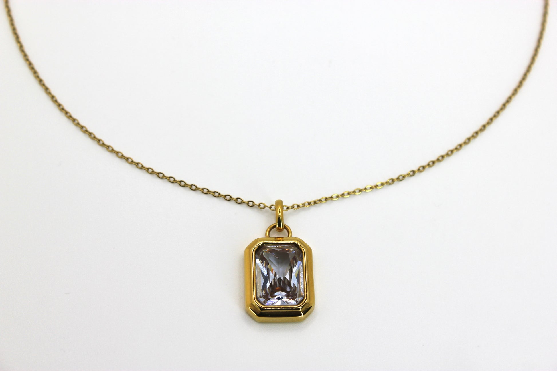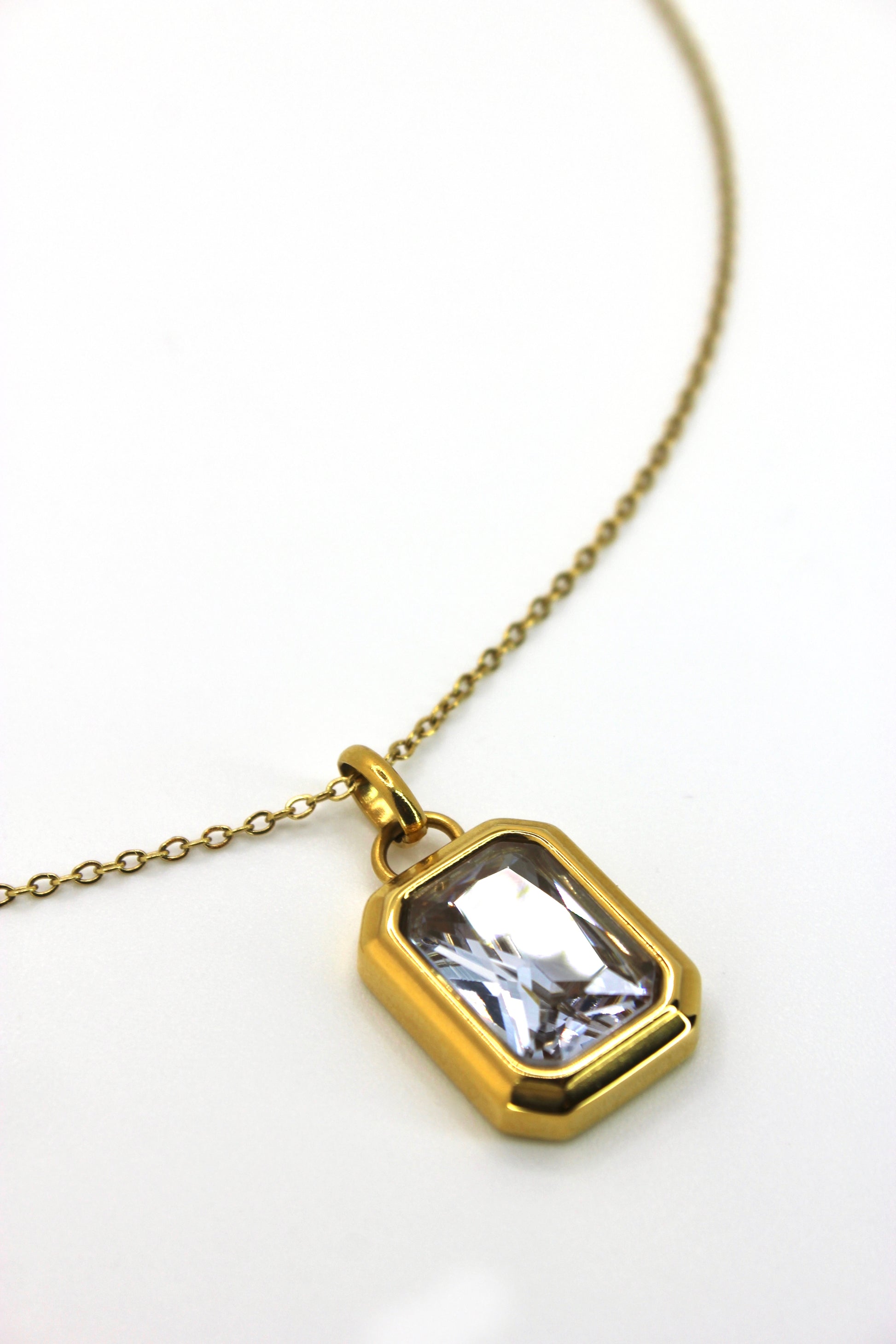 De Ariella-ketting heeft een gefacetteerde, rechthoekige hanger, lichtgevend en delicaat gezet in een goudkleurige roestvrijstalen zetting.
