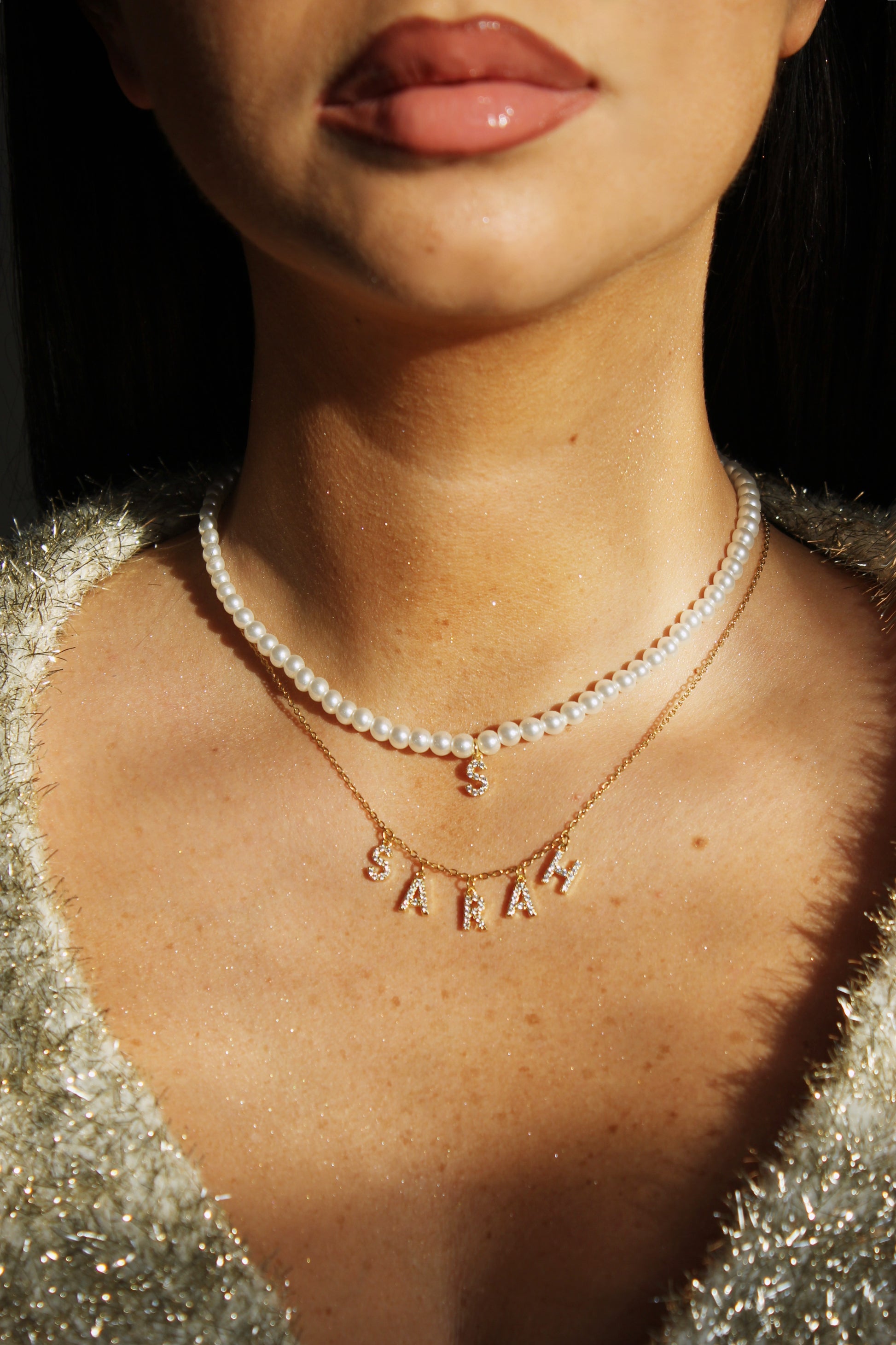 Le collier charms - Initial Glow allie la délicatesse d’un rang de perles à l’éclat d’une lettre pavée de cristaux, suspendue en pendentif.